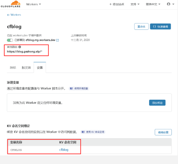 补充一下绑定步骤:workers->点击刚才新建的worker—>设置—>KV 命名空间绑定—>编辑变量—>变量名称:”CFBLOG”—>KV 命名空间:选择刚才的新建的KV