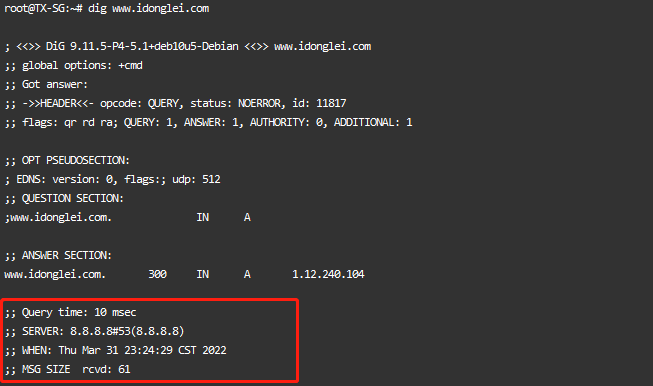 主要看Query time ,10ms就是解析时间。server就是当前解析的DNS服务器(本地)。