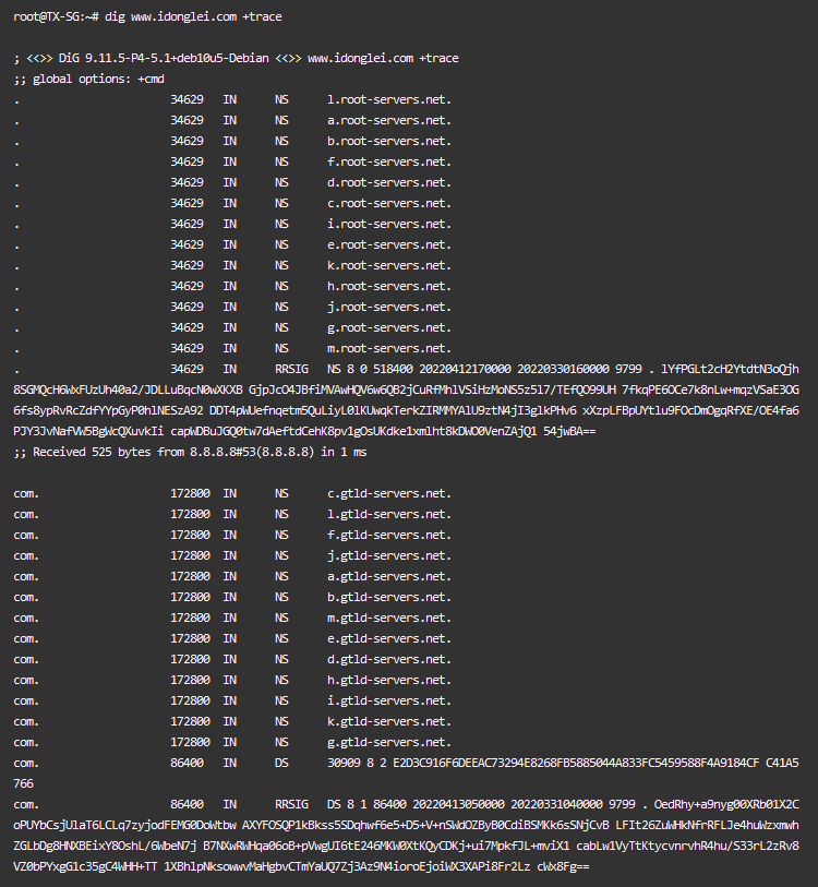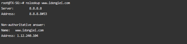 - 由顶级域名服务器查找到idonglei.com的二级域名服务器