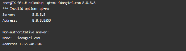 直接查询返回的是A记录,我们可以指定参数,查询其他记录,比如AAAA、MX等。
