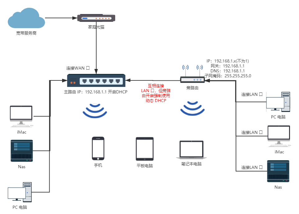 主路由(华为Ax3)负责WIFI信号和正常的拨号上网(PPPOE桥接模式),旁路由(N1)负责DHCP 服务和NAT转换以及分析、加密、解密数据包。而NAS顾名思义就是家庭网络存储器。