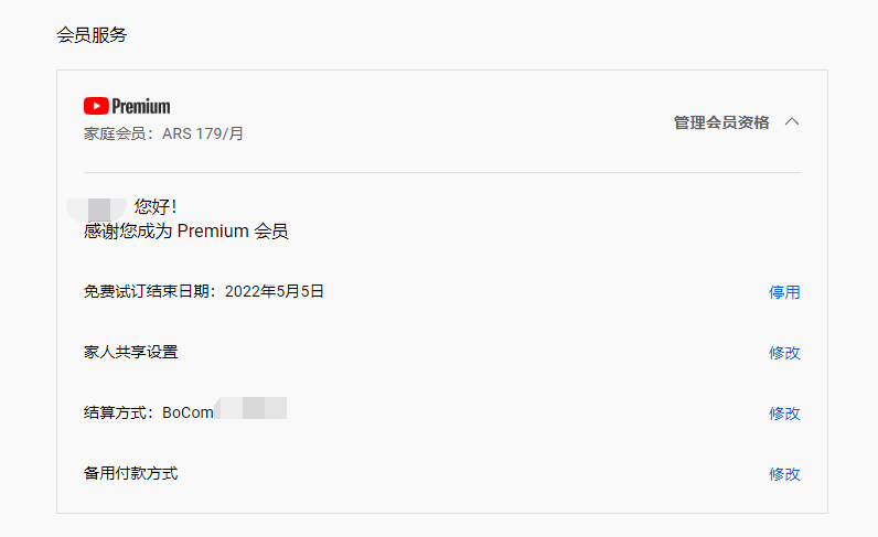 然后在YouTube Premium页面就可以看到订阅信息了。