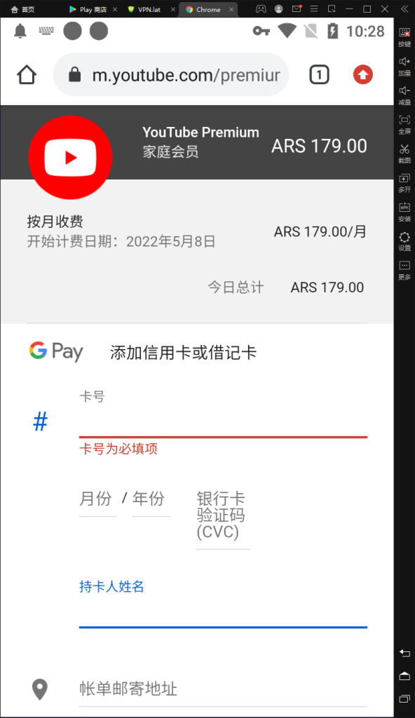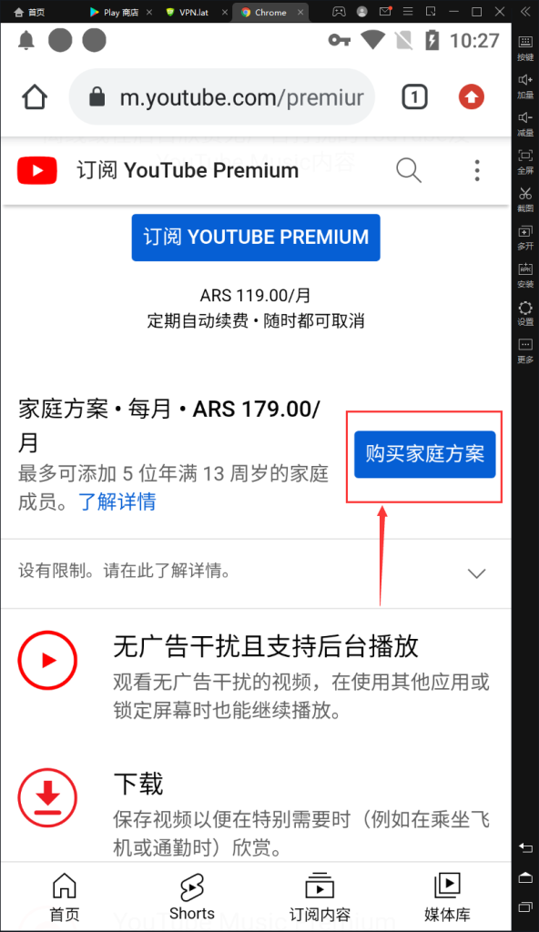 阿根廷代理开启之后,打开https://www.youtube.com/premium,然后查看是否有阿根廷比索的货币标识(ARS),如果有,就可以往下翻,找到家庭会员,创建阿根廷区的付款资料就可以订阅了。