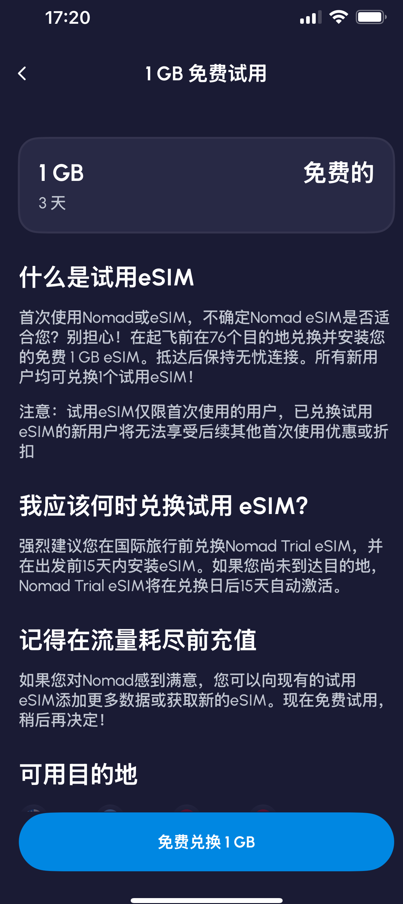 Nomad的免费1GB试用eSIM为你的海外出行提供了极大便利,从激活到使用都非常简单,无额外费用,帮你节省漫游漫长且复杂的流程。赶快下载Nomad应用,领取免费试用,体验全新旅行网络服务吧!