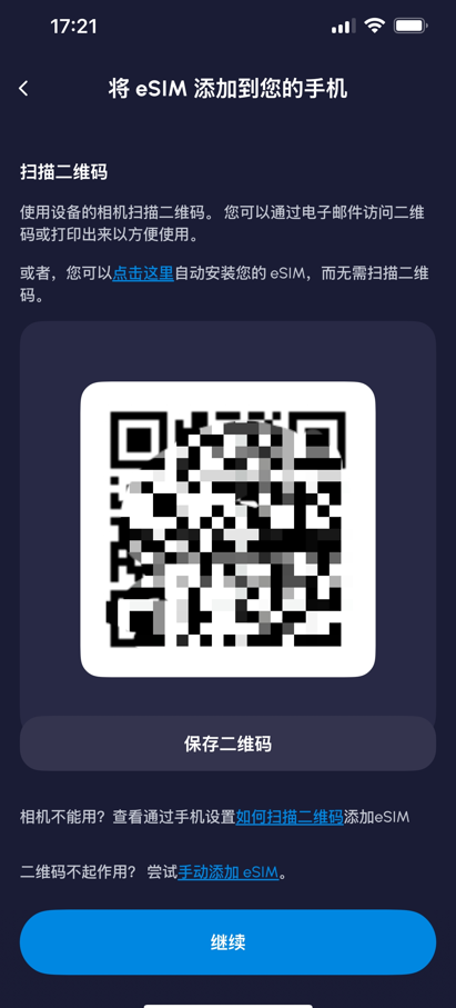 - 对iOS用户:前往“设置” > “蜂窝网络” > “添加蜂窝计划”,扫描二维码后完成安装。