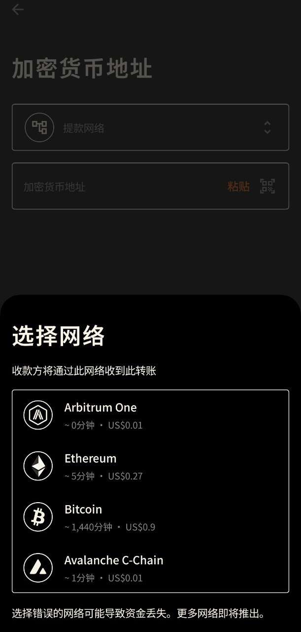 同样支持法币出金和加密货币出金,支持Arb/Eth/Bitcoin/AvaxC